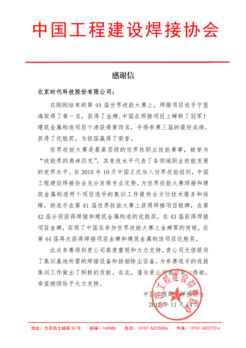 中國工程建設焊接協(xié)會(huì )感謝時(shí)代焊機提供世賽培訓用機
