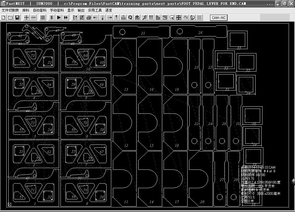 FastCAM 全自動(dòng)套料軟件主要用于繪圖、套料、切割工藝編程、NC 程序校驗與模擬、鋼材與加工成本統計報表、NC 與DXF/CAM/NC 文件轉換等。